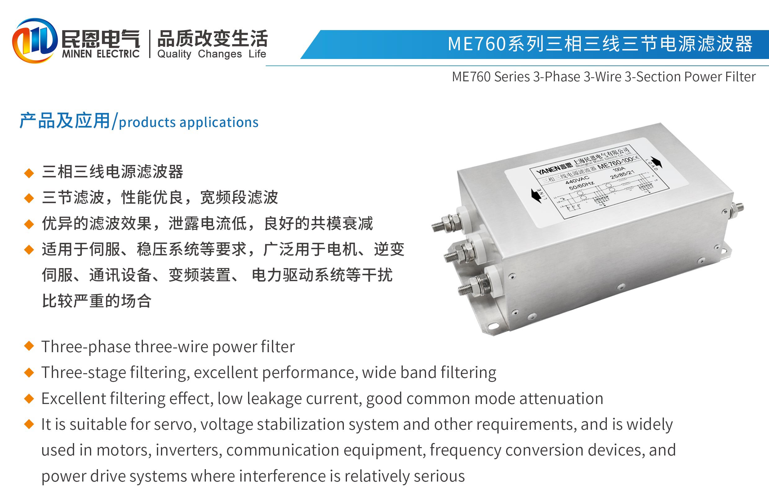 三相三線濾波產品,三節濾波,性能優良,寬頻段濾波,優異的濾波效果,泄露電流低,良好的共模衰減