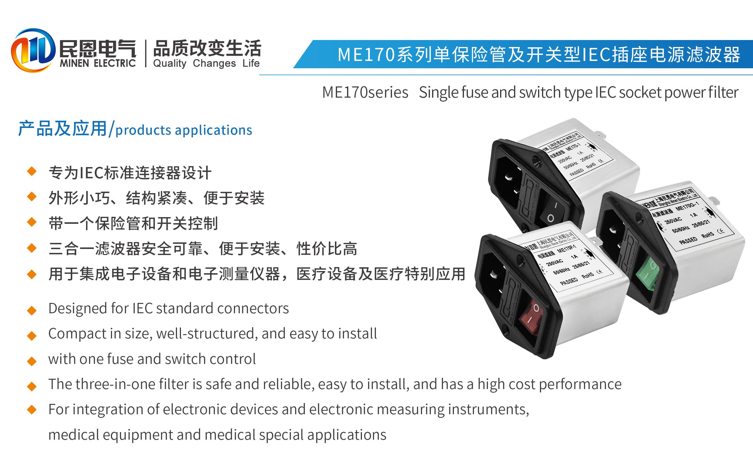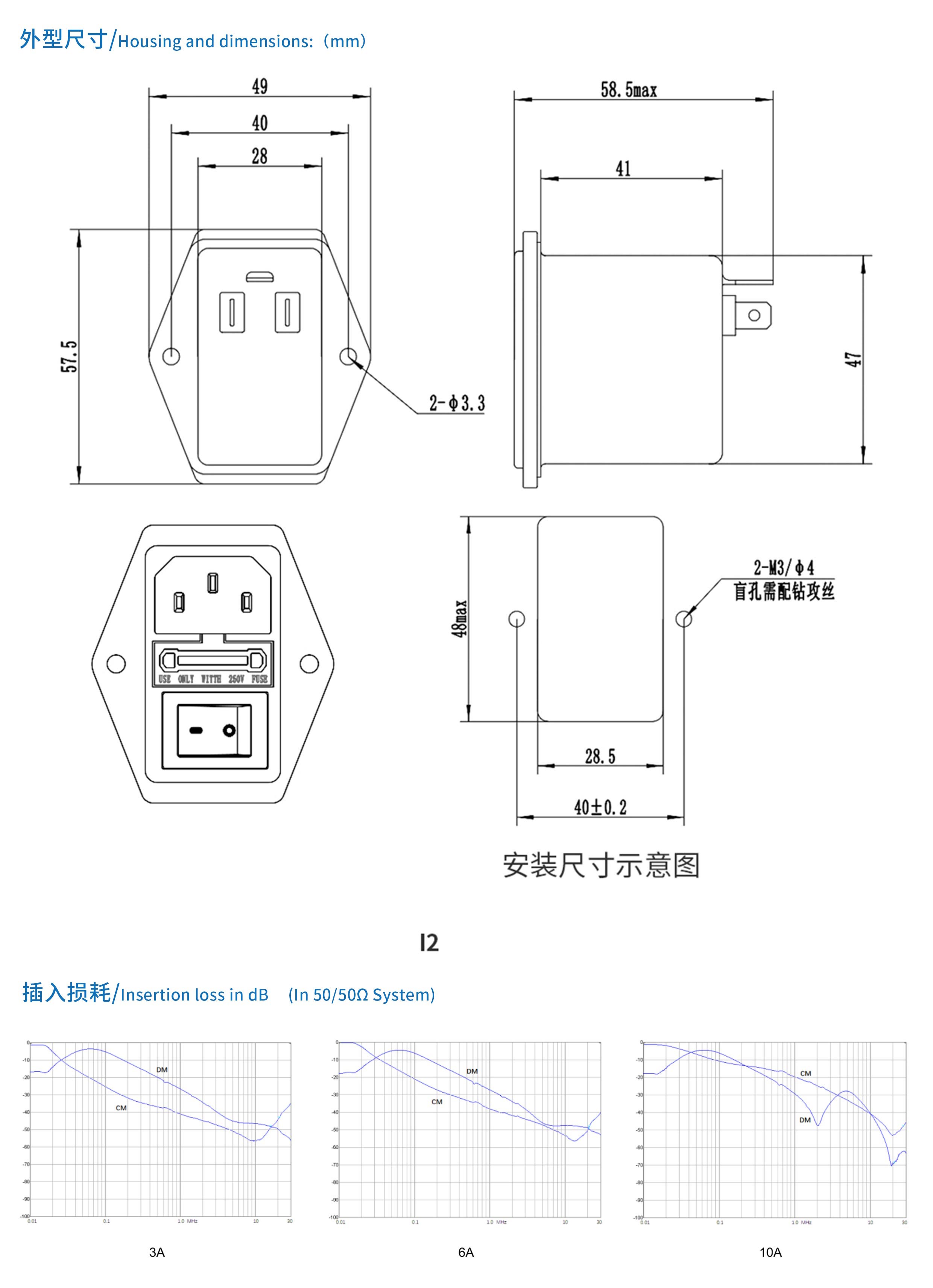 專為IEC標準連接器設計,外形小巧、結構緊湊、便于安裝,帶一個保險管和開關控制,三合一濾波器安全可靠、便于安裝、性價比高