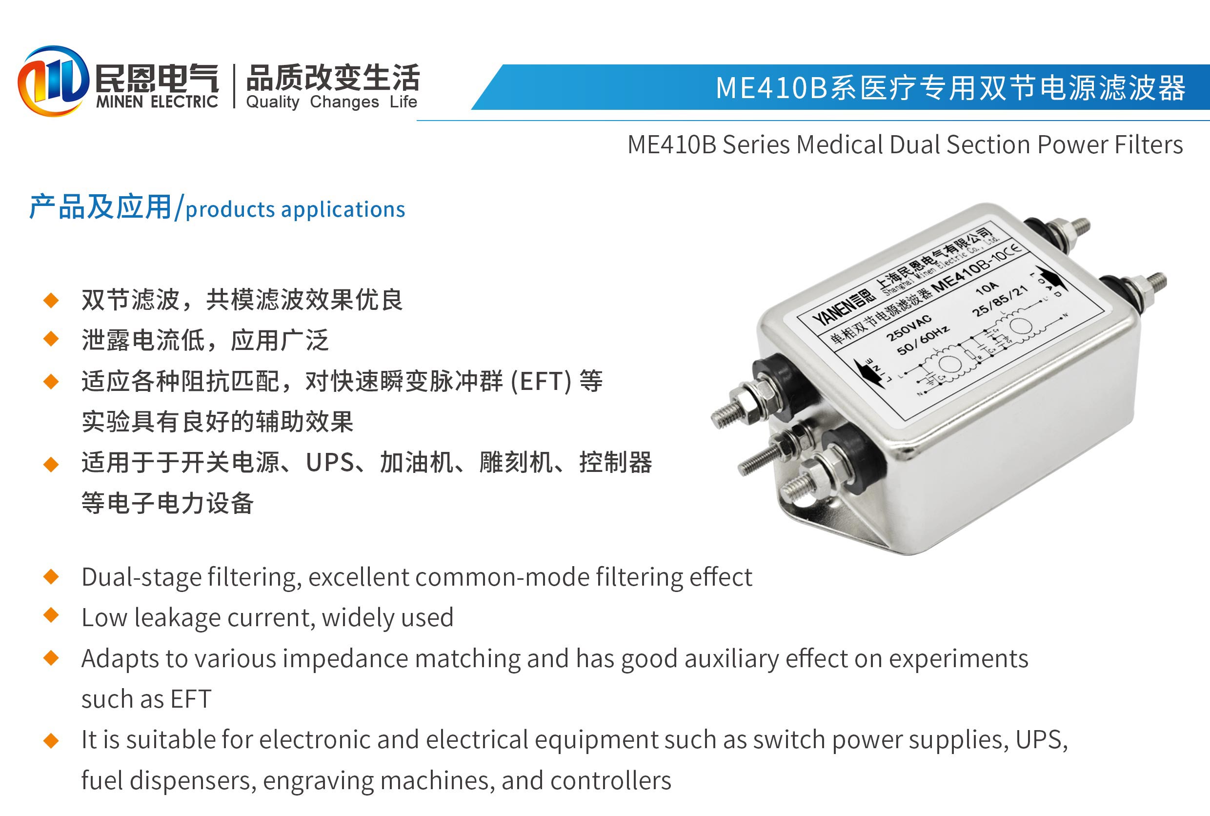 雙節濾波,共模濾波效果優良,泄露電流低,應用廣泛,適應各種阻抗匹配,對快速瞬變脈沖群 (EFT) 等實 驗具有良好的輔助效果。