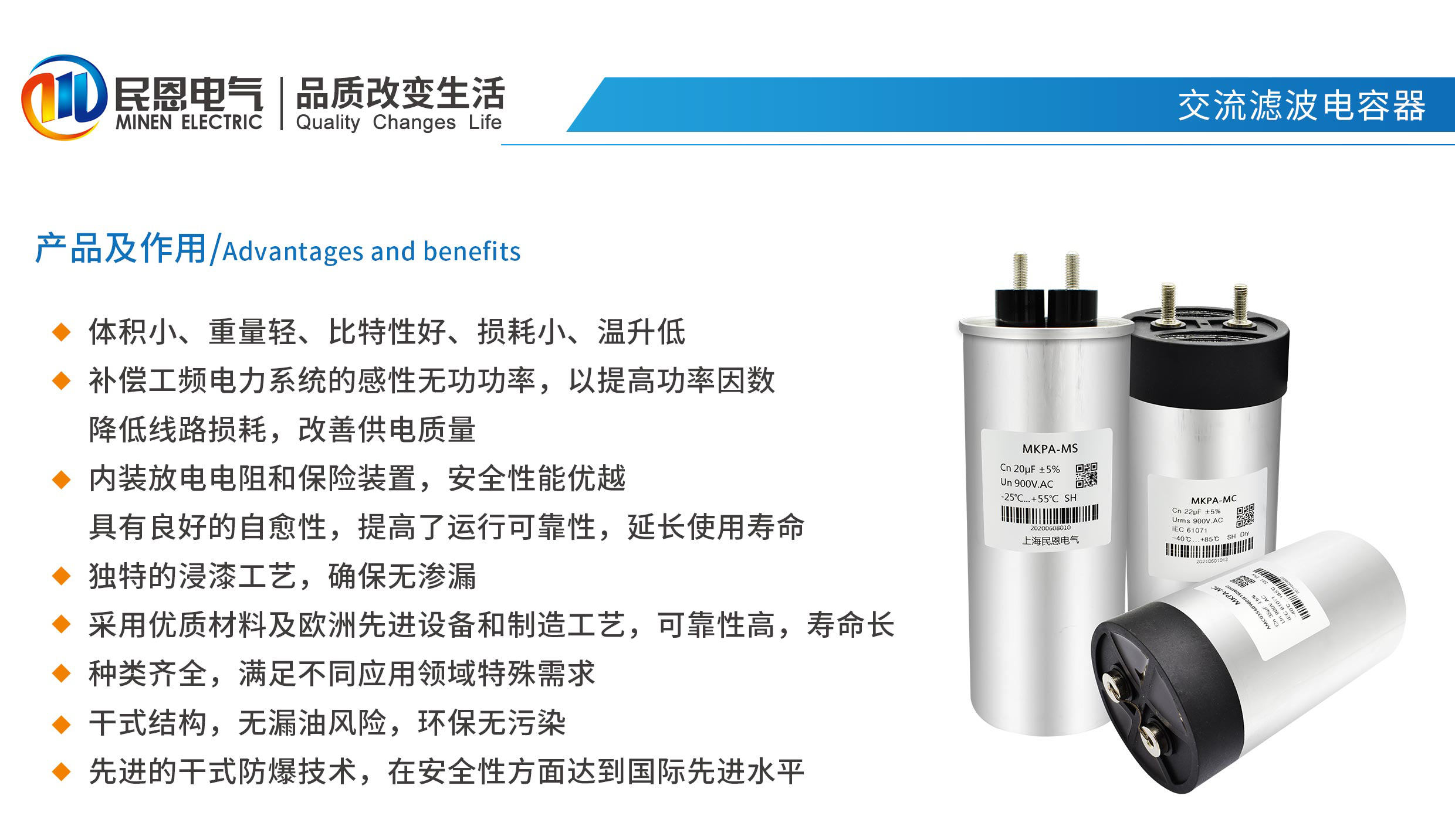 體積小、重量輕、比特性好、損耗小、溫升低,補償工頻電力系統的感性無功功率,以提高功率因數降低線路損耗,改善供電質量,內裝放電電阻和保險裝置,安全性能優越具有良好的自愈性,提高了運行可靠性,延長使用壽命,獨特的浸漆工藝,確保無滲漏,采用優質材料及歐洲先進設備和制造工藝,可靠性高,壽命長,種類齊全,滿足不同應用領域特殊需求,干式結構,無漏油風險,環保無污染,先進的干式防爆技術,在安全性方面達到國際先進水平