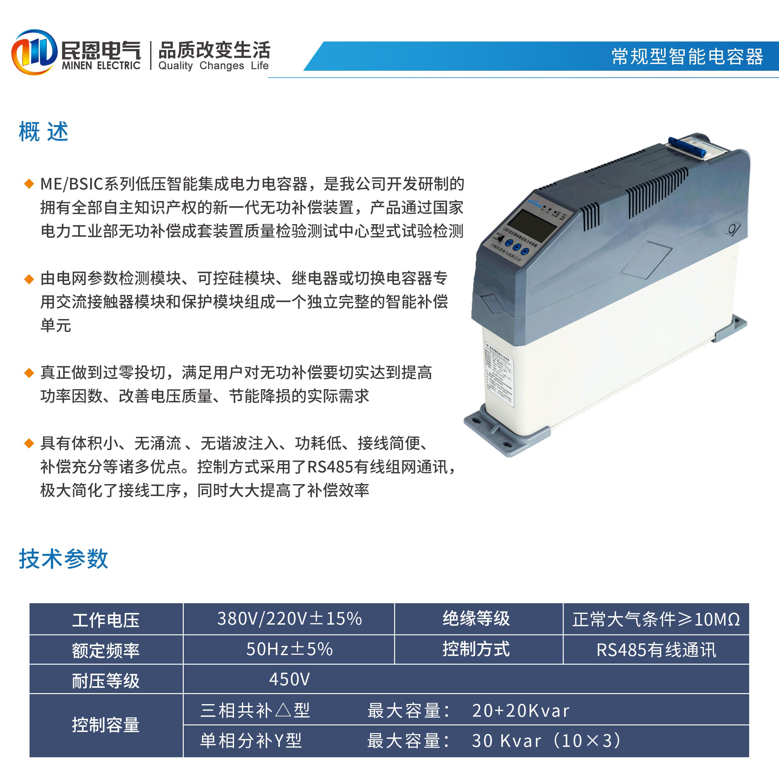 低壓智能集成電力電容器,是我公司開發研制的擁有全部自主知識產權的新一代無功補償裝置,產品通過國家電力工業部無功補償成套裝置質量檢驗測試中心型式試驗檢測。 產品由電網參數檢測模塊、可控硅模塊、繼電器或切換電容器專用交流接觸器模塊和保護模塊組成一個獨立完整的智能補償單元。真正做到過零投切,滿足用戶對無功補償要切實達到提高功率因數、改善電壓質量、節能降損的實際需求。具有體積小、無涌流 、無諧波注入、功耗低、接線簡便、補償充分等諸多優點。控制方式采用了RS485有線組網通訊,極大簡化了接線工序,同時大大提高了補償效率。